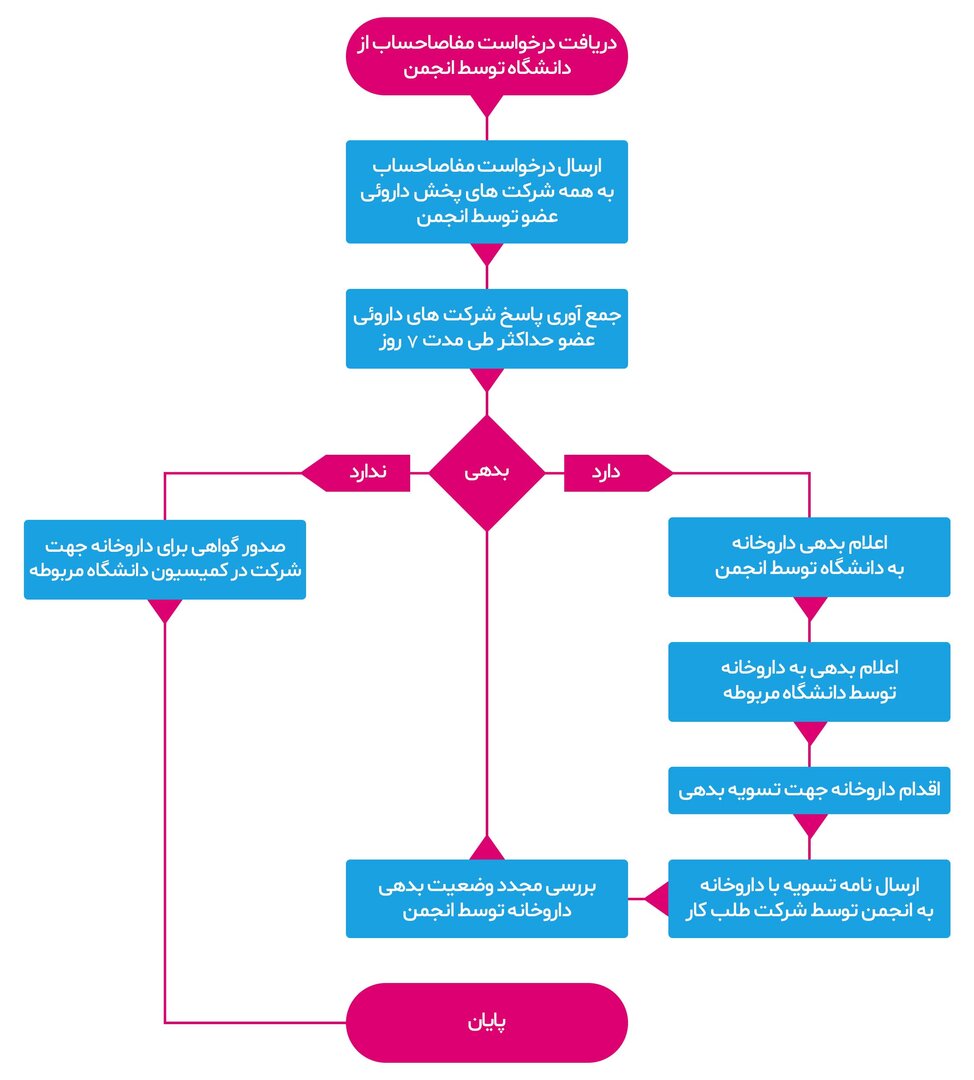 انجمن صنعت پخش ایران به منظور حراست از منافع اعضاء خود و همچنین تسهیل فرایند تسویه حساب داروخانه ها در زمان انتقال سرمایه، تعطیلی داروخانه، قطع سهمیه دارو و … با شرکت های پخش دارویی اقدام به همکاری با سازمان غذا و دارو نموده است بنابراین با توجه به ماده 14 بند 14-10 ضوابط تأسیس و اداره داروخانه ها “ارائه مفاصا حساب از شرکت های پخش دارویی از طریق انجمن صنعت پخش” بوده و مطابق تبصره 2 همین ماده “انجمن صنعت پخش موظف است در مدت 10 روز کاری پاسخگو باشد.”